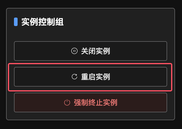 确认账号 状态正常 后,登录管理后台,点击管理,点击重启实例以重启启当前实例。